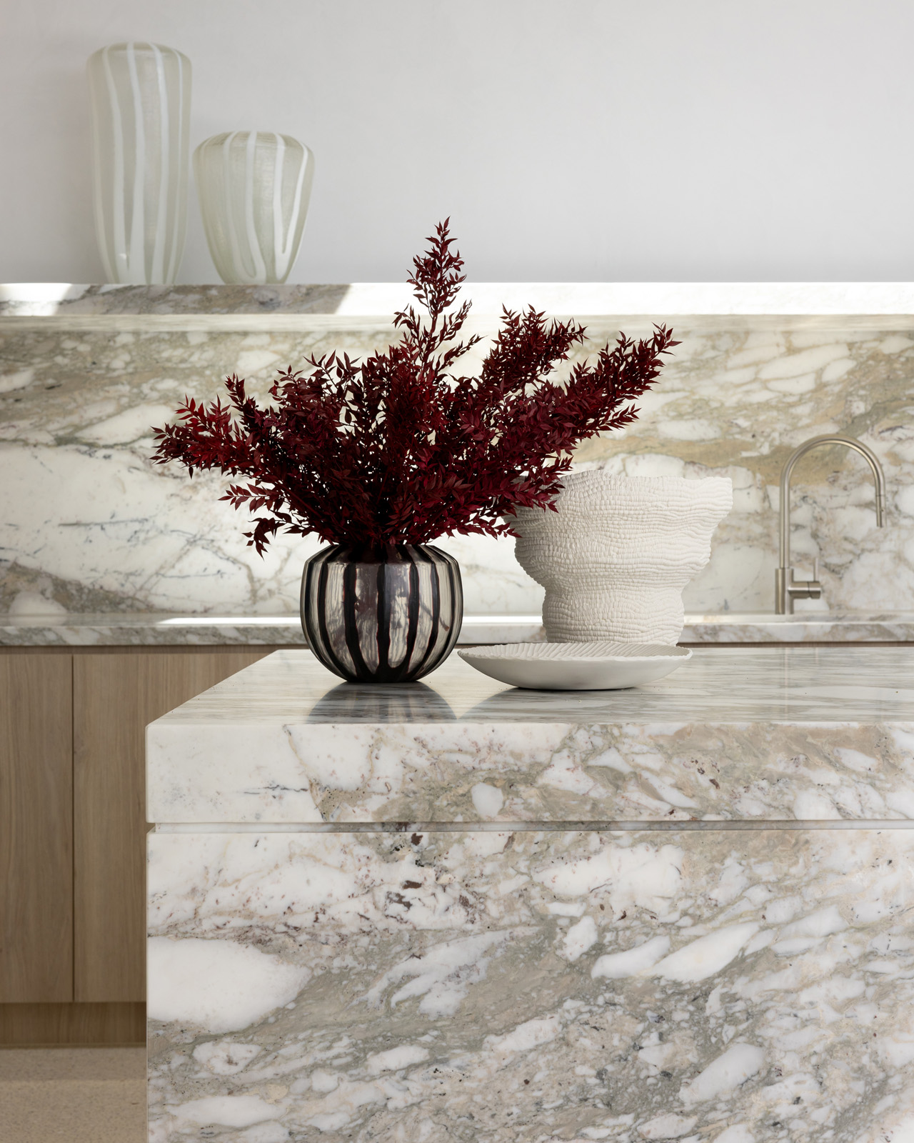 The Banda vases are mouth-blown and fused with rich mahogany and clear glass, creating a bold striped pattern that defines their striking silhouette.