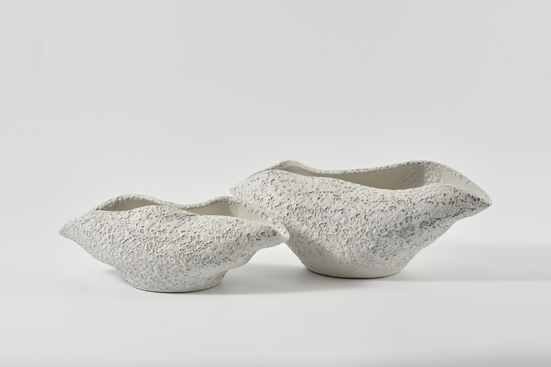 Salt crust finish –This handmade surface is alive with clustered bubbles, frozen mid-rise, creating a landscape of soft craters and luminous pockets of air.