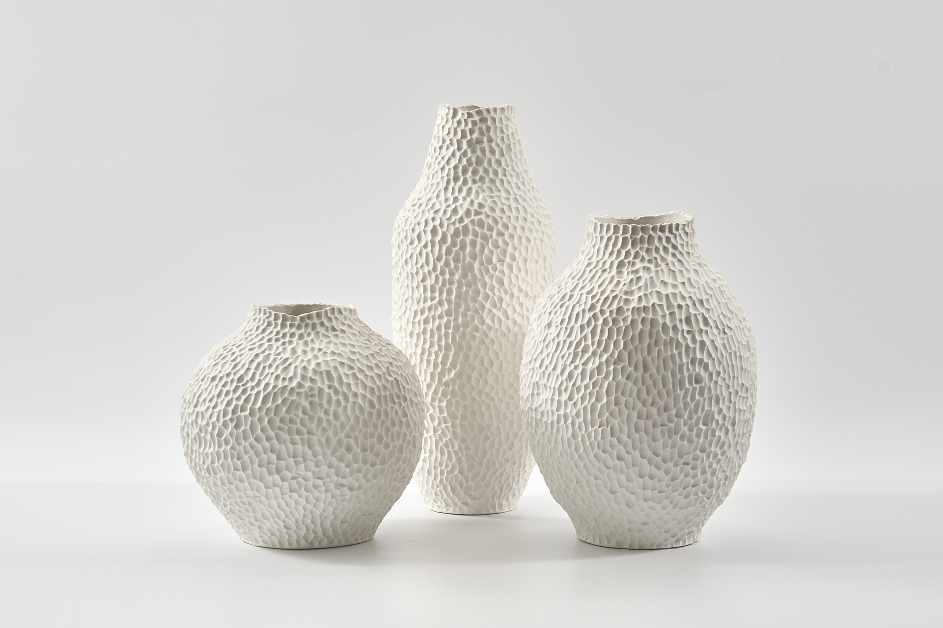 This hand-crafted ceramic vase is finished with a hand-cut, cratered surface that echoes the rugged beauty of the moon’s landscape. Each indentation is carved individually, creating a richly textured surface that captures light and shadow like the lunar surface at night. Subtle variations in depth and form make every piece unique, transforming the vase into both a functional vessel and a sculptural object reminiscent of celestial terrain.